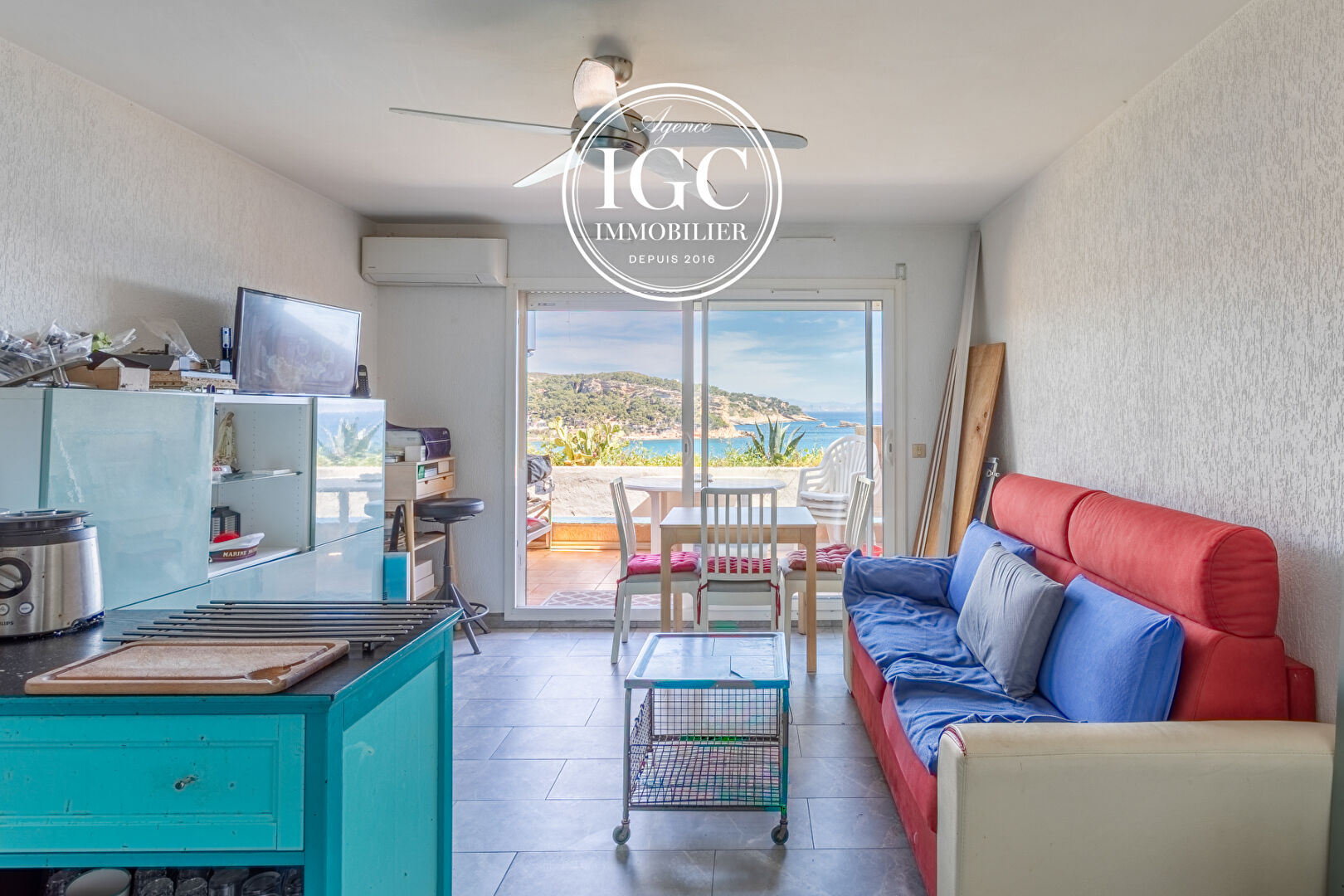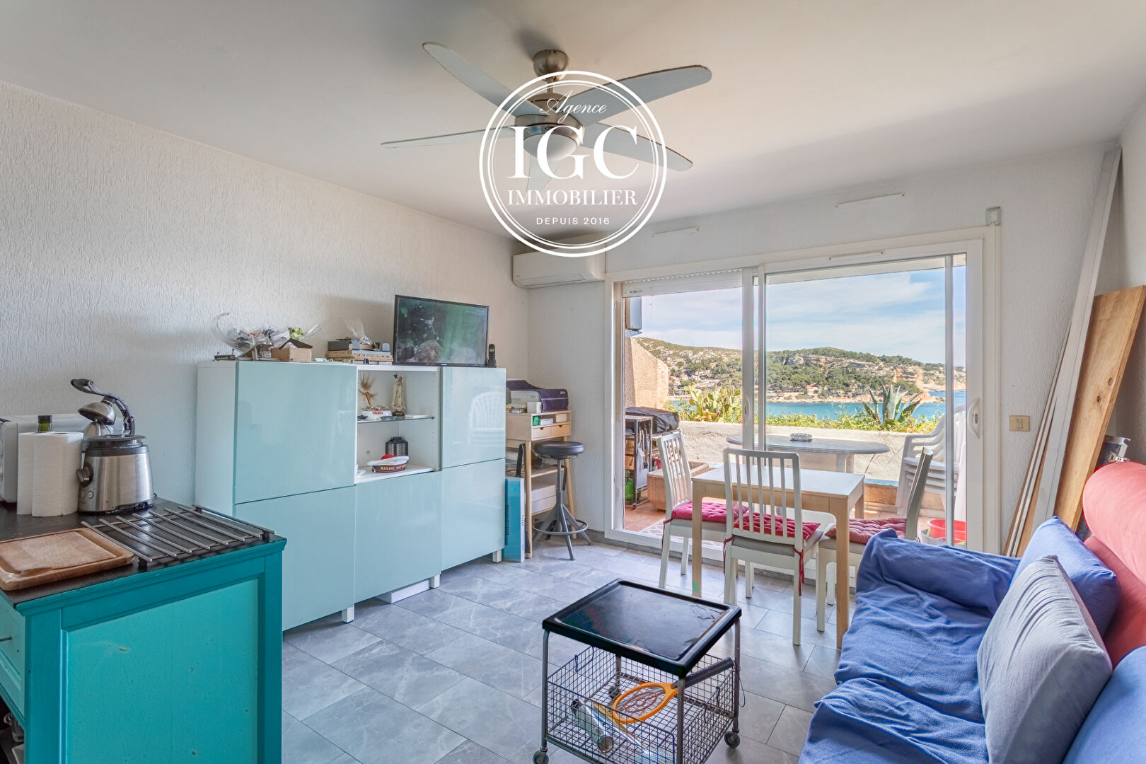 L’espace de vie, fonctionnel et lumineux, permet un aménagement optimisé pour profiter pleinement de ce pied-à-terre sur la Côte Bleue.