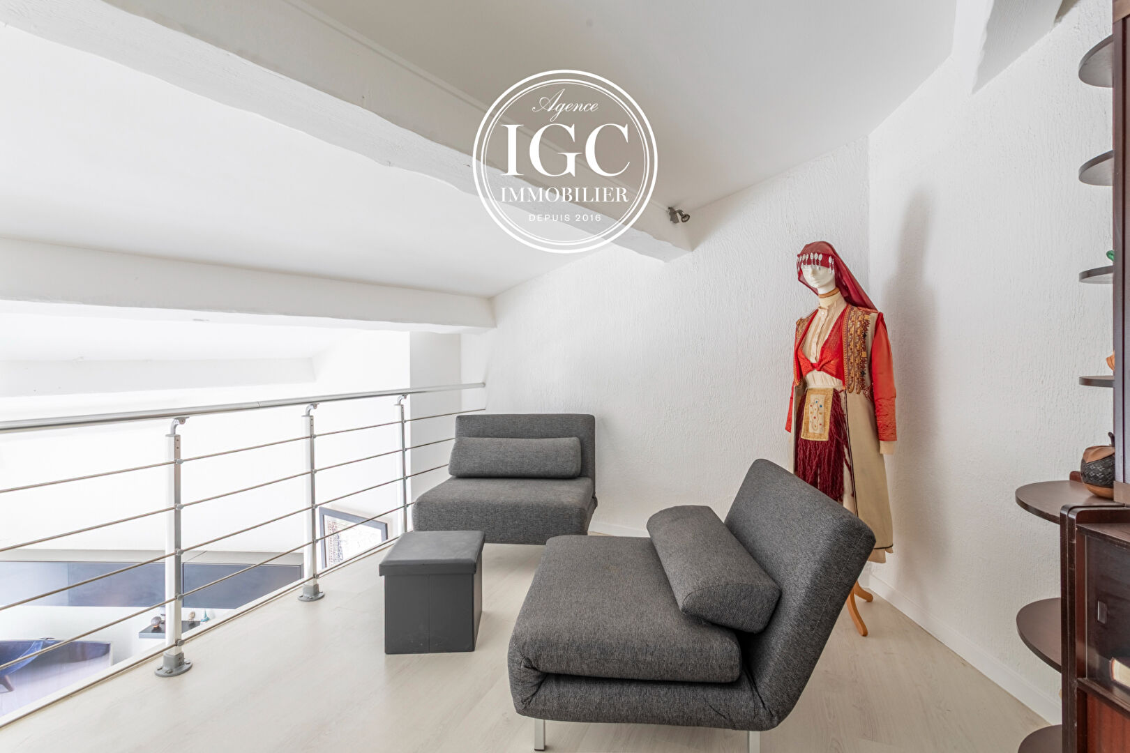 L’Étage (Espace Parental ou Travail) : Une mezzanine aménagée en petit salon cosy (idéal pour la lecture), un bureau pour le télétravail et une salle d’eau.