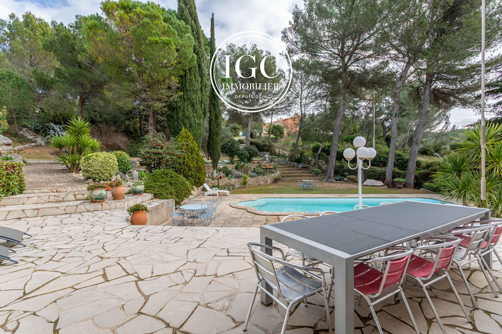 Le terrain est un véritable écrin de verdure aux essences méditerranéennes. L’espace piscine, véritable havre de paix, vous invite à la détente absolue loin des regards indiscrets.