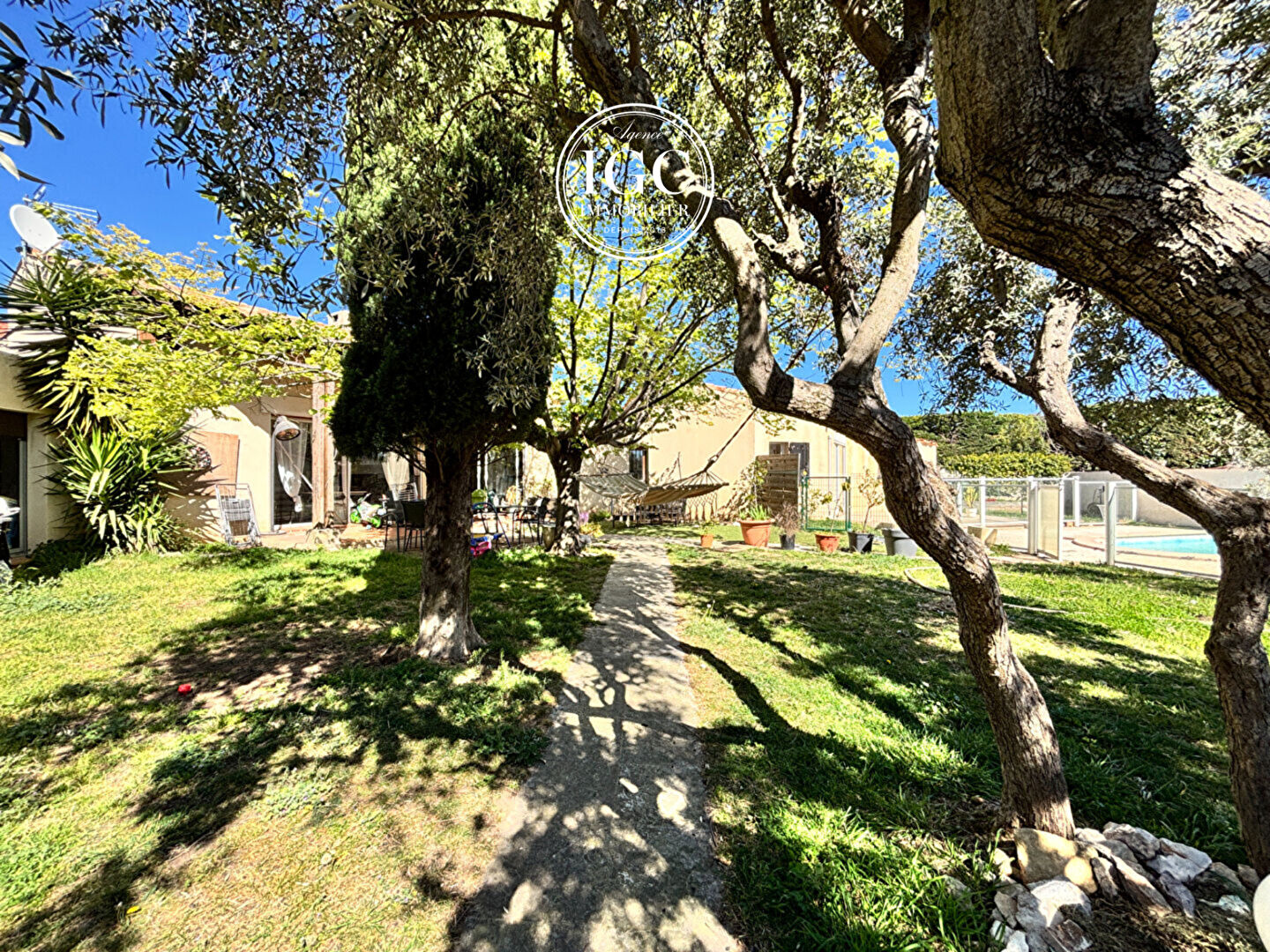 vous bénéficierez d’un jardin arboré exposé plein sud, agrémenté d’une piscine.